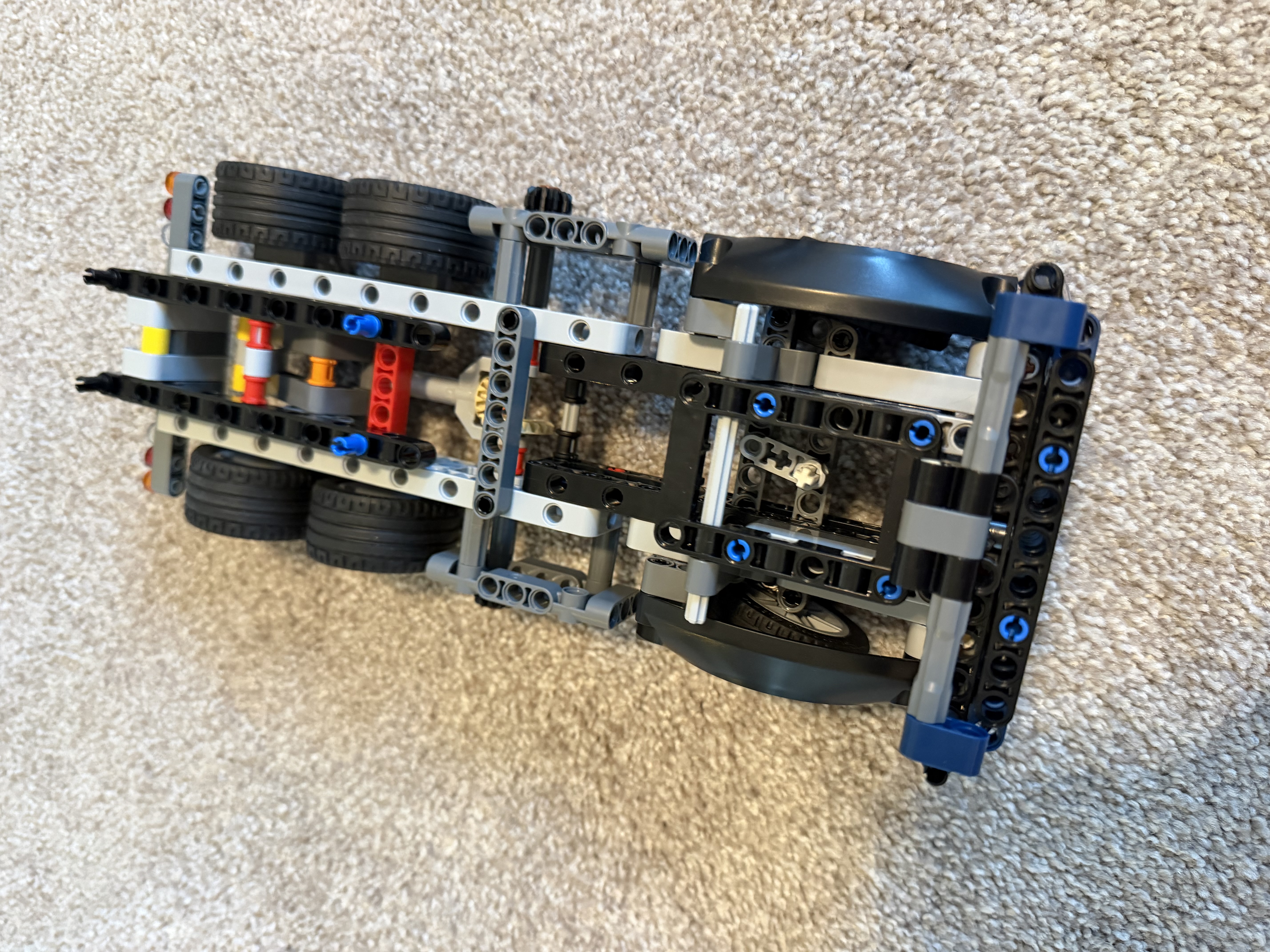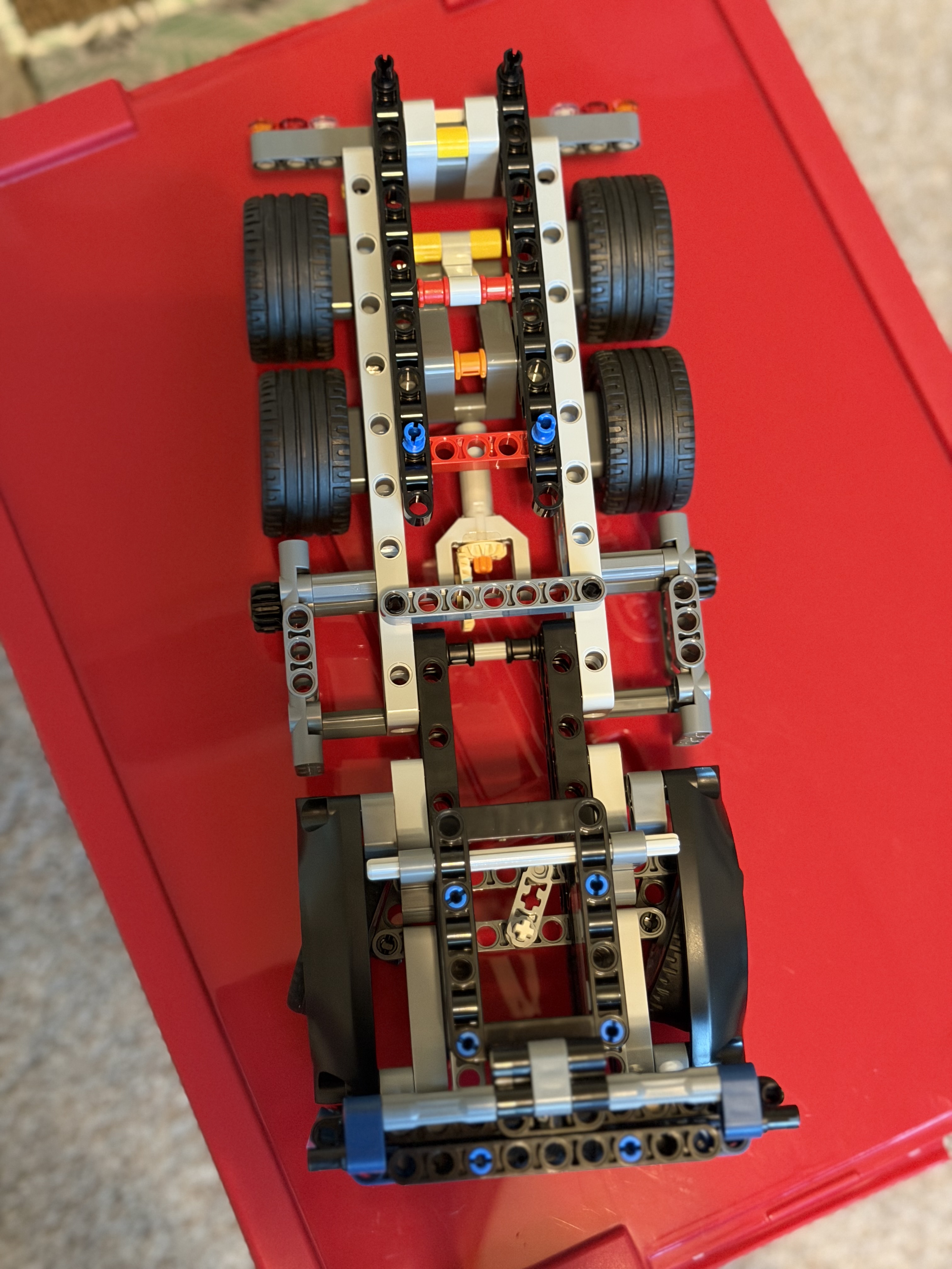 Here’s the base frame for the upgraded truck! I removed the original gear set that lifts and lowers the cargo bed and used the space for the two motors.