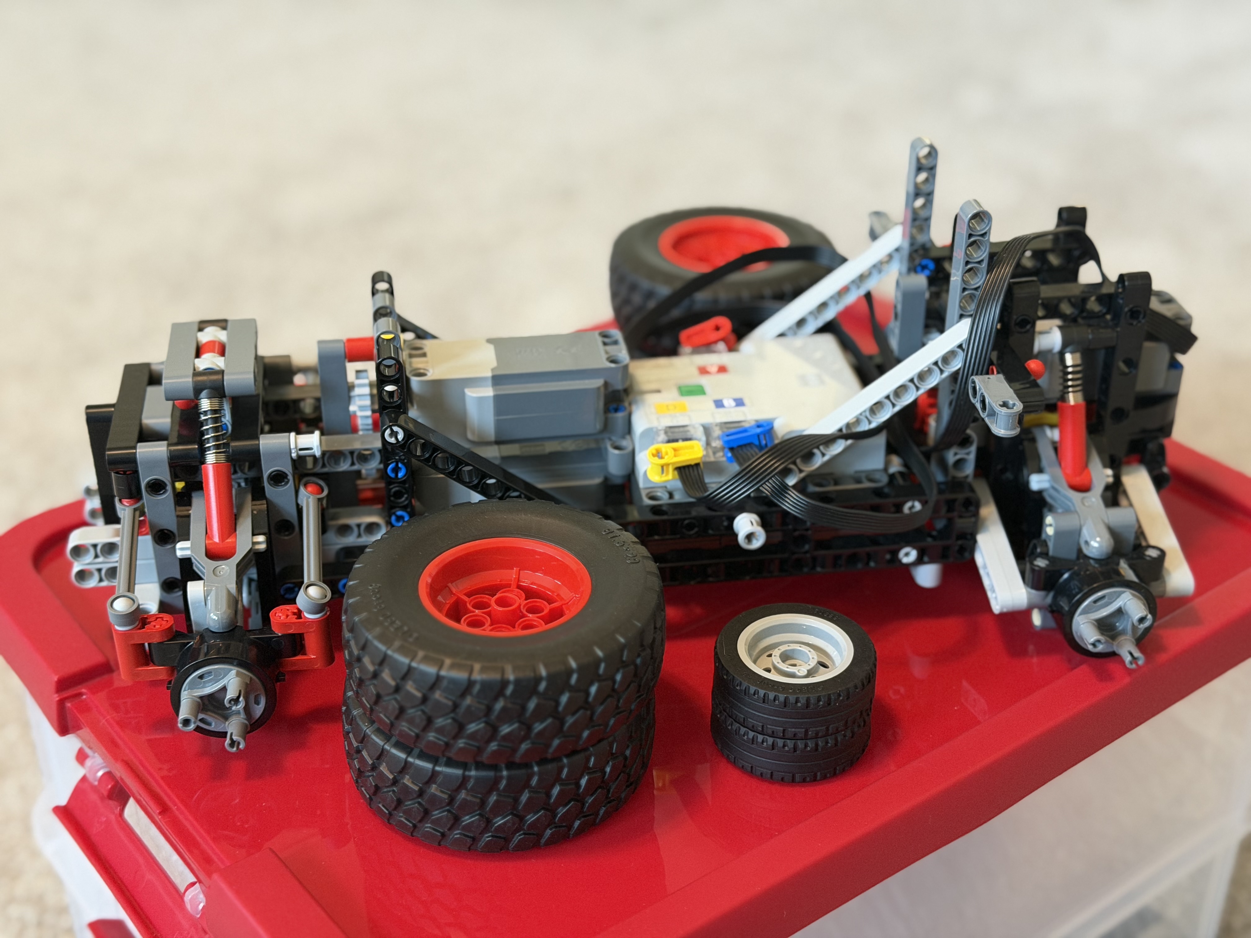 Here are the guts of the Audi rally car. I placed the truck’s tires next to the monster Audi rally car’s tires. How much smaller the truck’s tires are! I’ll design a new driving and steering system for the truck, reuse the motors and hub from the LEGO Audi, and keep the truck’s form factor.